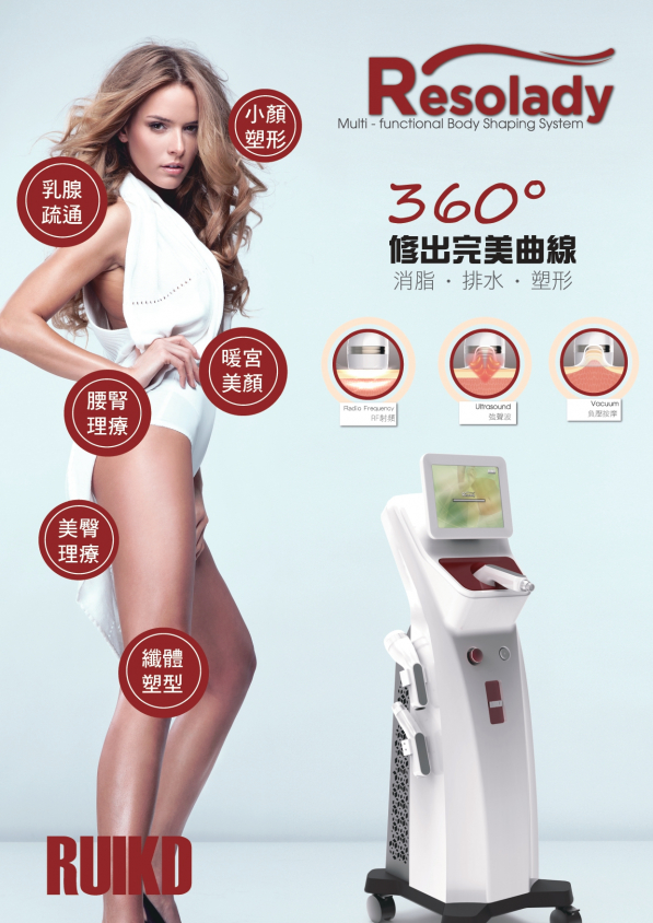 Resolady 集三種功能之廋身溶脂系統,使用雙極射頻、超聲波和真空負壓按摩,重點修整身體線條,減少囤積脂肪,更有效減輕肌肉疼痛,專業非侵入性治療,專為健康快速塑形而設計