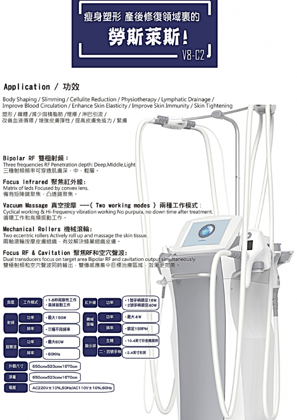 集聚焦R F、聚焦紅外線、真空按摩、機械滾輪四大功能,雙極射頻和空穴聲波同時輸出,雙傳感應集中目標治療區域,效果更完美!
