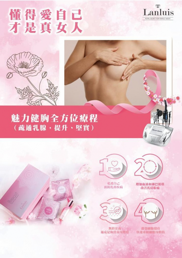乳房異常成為都市女性三大問題之一,嚴重危害女性的身心健康,所以定期作適量的護理,也能防止小葉堵塞保持胸部健康。 配合Lanluis Breast Queen美胸儀用作檢測 •保養 • 美胸 • 緊緻 •豐胸等功用